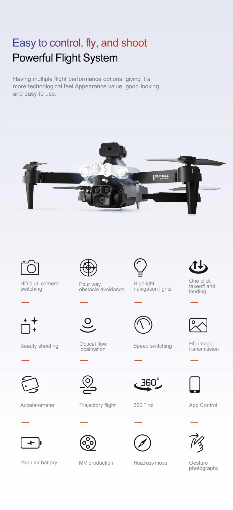 One-key take-off/one-key landing/ascent/descent/left/right direction/360° roll/headless mode/speed/slow speed/photo/video/dual camera switch/automatic photo face recognition/gravity sensor/ runway flight/